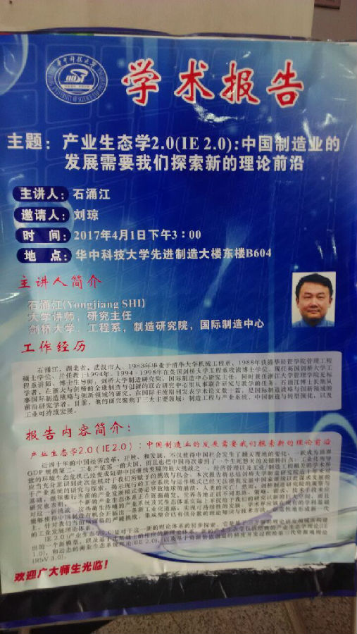 4月1日下午学术报告:产业生态学2.0——中国制造业的发展需要我们探索新的理论前沿